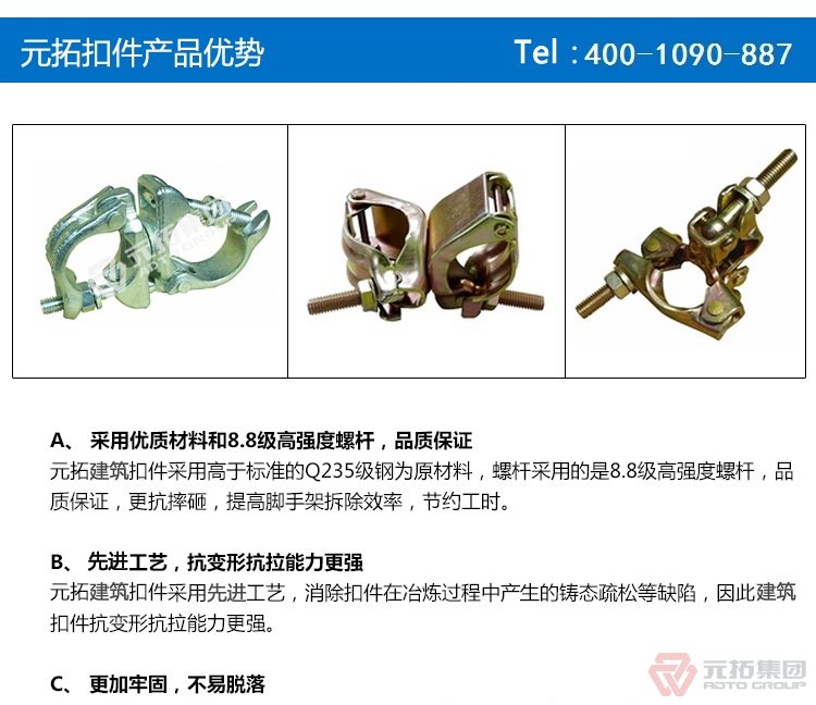 元拓集團(tuán)生產(chǎn)銷售的出口型扣件,腳手架扣件,建筑絲杠,碗扣腳手架配件等,產(chǎn)品嚴(yán)格按照GB15831-2006國(guó)家標(biāo)準(zhǔn)檢驗(yàn)后出廠,質(zhì)量長(zhǎng)期穩(wěn)定可靠,產(chǎn)品被廣泛應(yīng)用于建筑工程行業(yè).暢銷全國(guó)各地建筑市場(chǎng),并出口到多個(gè)國(guó)家和地區(qū),產(chǎn)品質(zhì)量?jī)?yōu)異,全國(guó)排名榜首,服務(wù)專業(yè)完善,得到了各方客戶的認(rèn)可和支持。