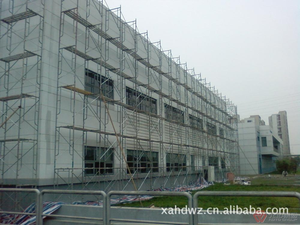 (1)多功能:門式腳手架可組成不同組架尺寸、形狀和承載能力的單、雙排腳手架,能根據(jù)具體施工要求,作為支撐架,支撐柱,物料提升架,爬升腳手架,懸挑架等多種功能的施工裝備。也可用于搭設(shè)施工棚、料棚、燈塔等構(gòu)筑物。特別適合于搭設(shè)曲面腳手架和重載支撐架。